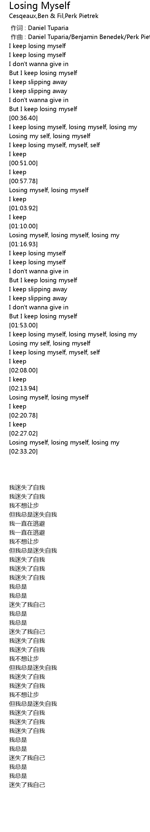 | [02:30.00] | Losing myself, losing myself, losing my |