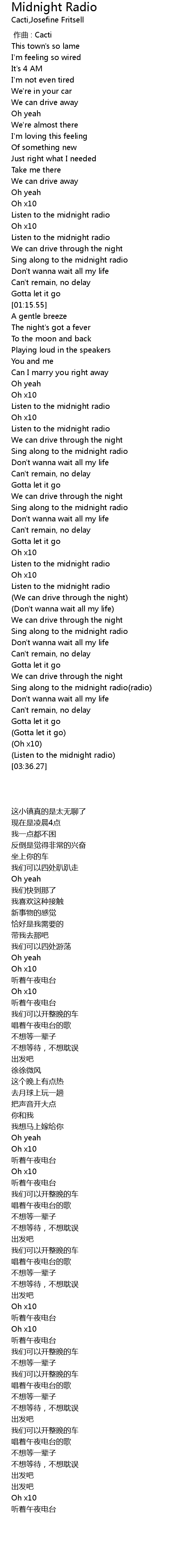 | [02:23.36] | Listen to the midnight radio |