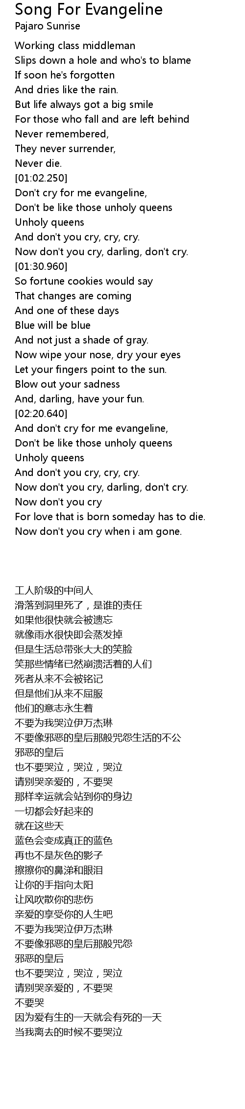 And don't cry for me evangeline, |