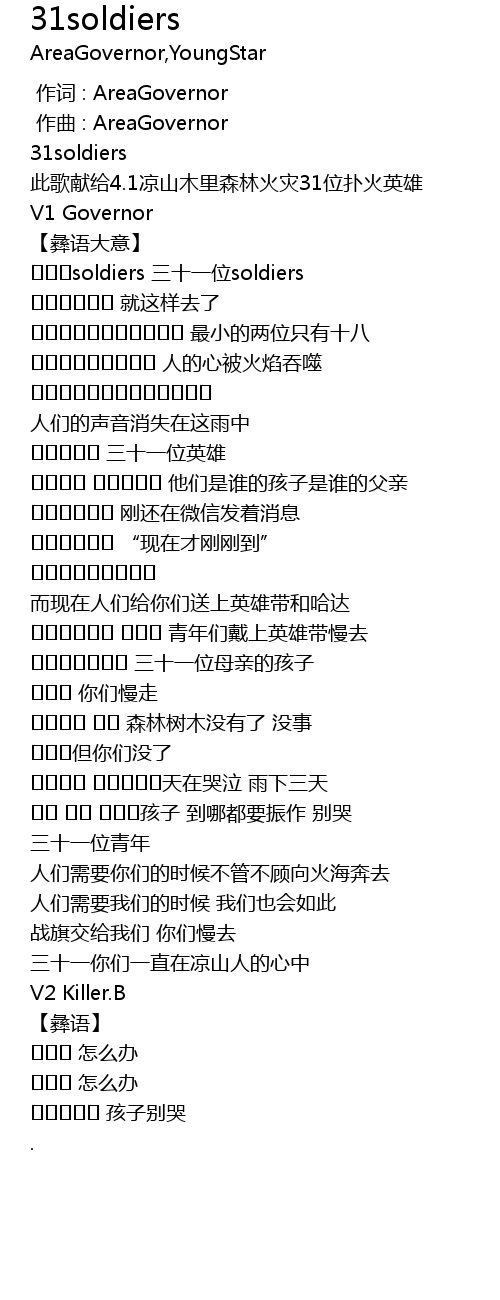| [00:17.685] | 此歌献给4.1凉山木里森林火灾31位扑火英雄 |