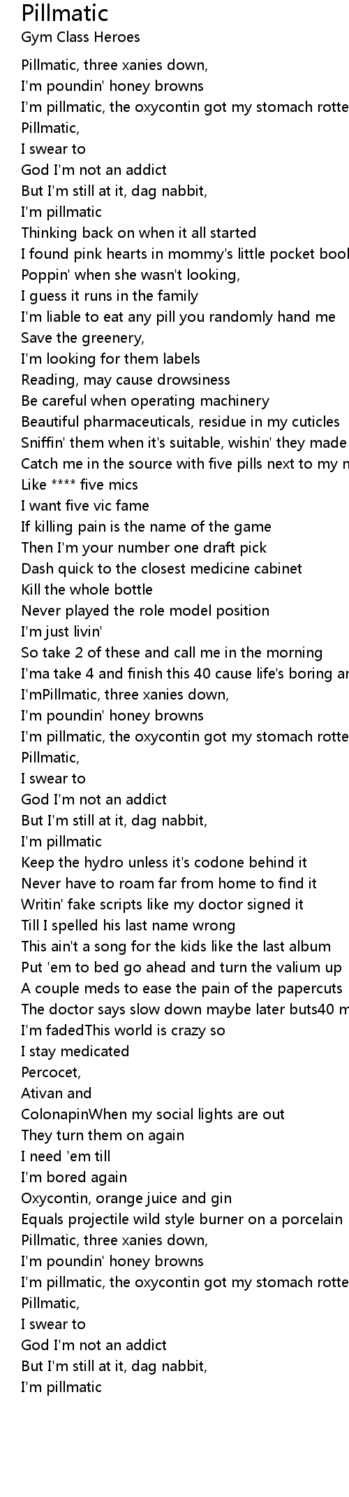 I'm pillmatic, the oxycontin got my stomach rotten |