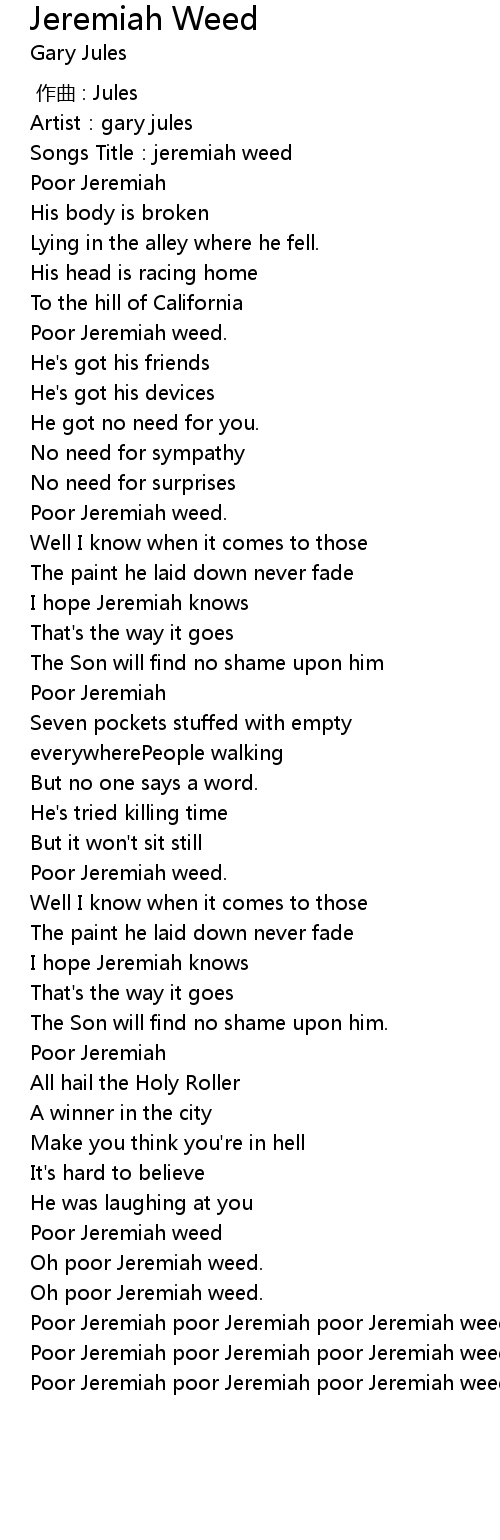 | [03:30.21] | Poor Jeremiah poor Jeremiah poor Jeremiah weed |