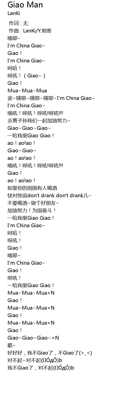 | [00:26.686] | 诶~咦耶~咦耶~咦耶~I'm China Giao~ |