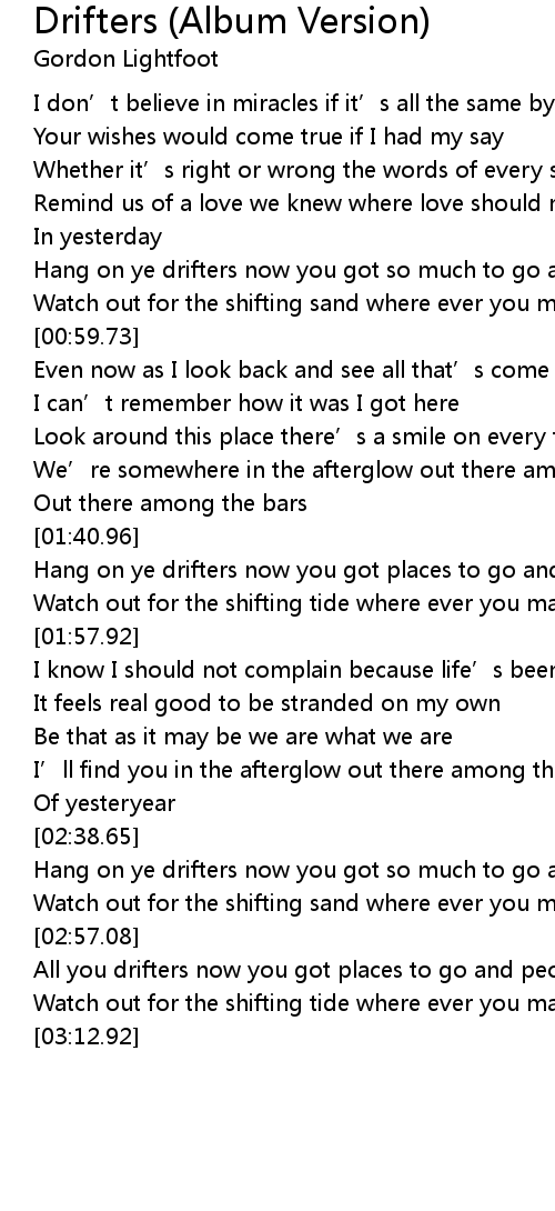 | [00:40.97] | Hang on ye drifters now you got so much to go and gamble on |