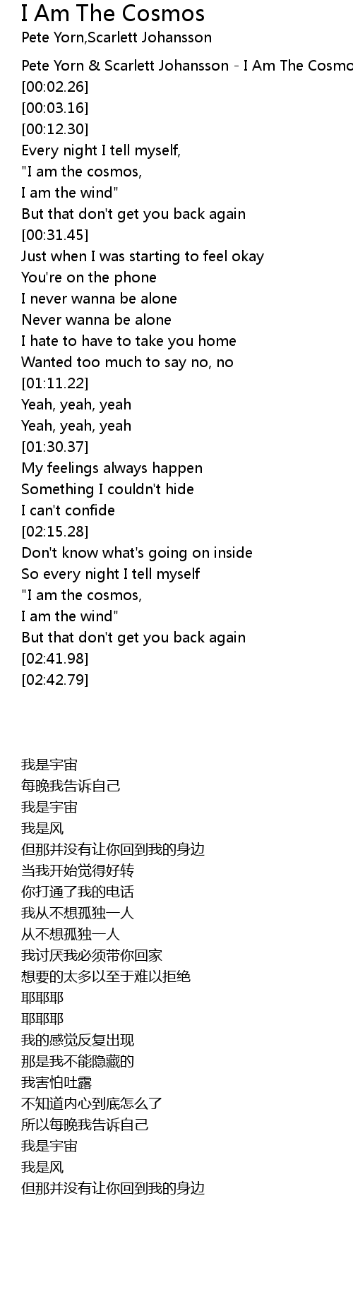 | [00:00.65] | Pete Yorn & Scarlett Johansson - I Am The Cosmos |