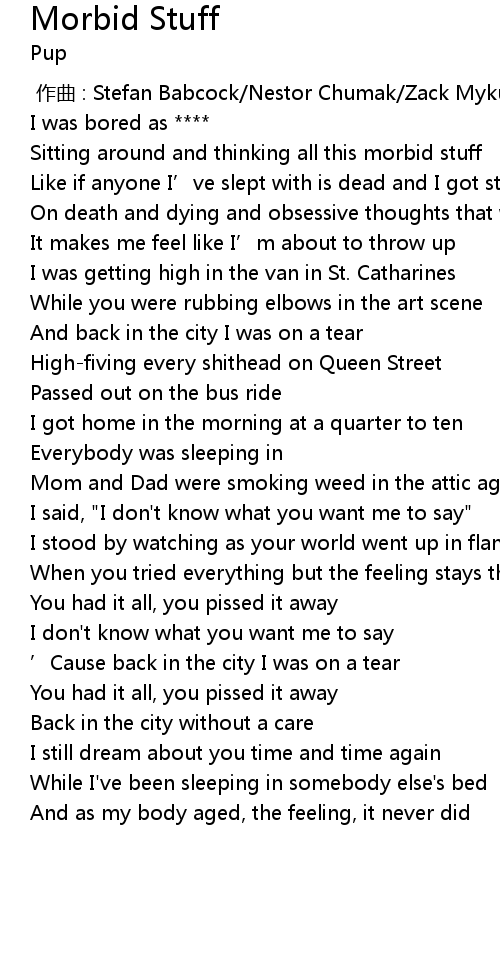 | [00:19.79] | Sitting around and thinking all this morbid stuff |