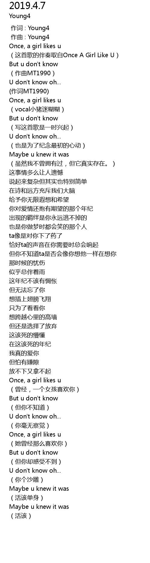 | [00:12.404] | Once, a girl likes u |