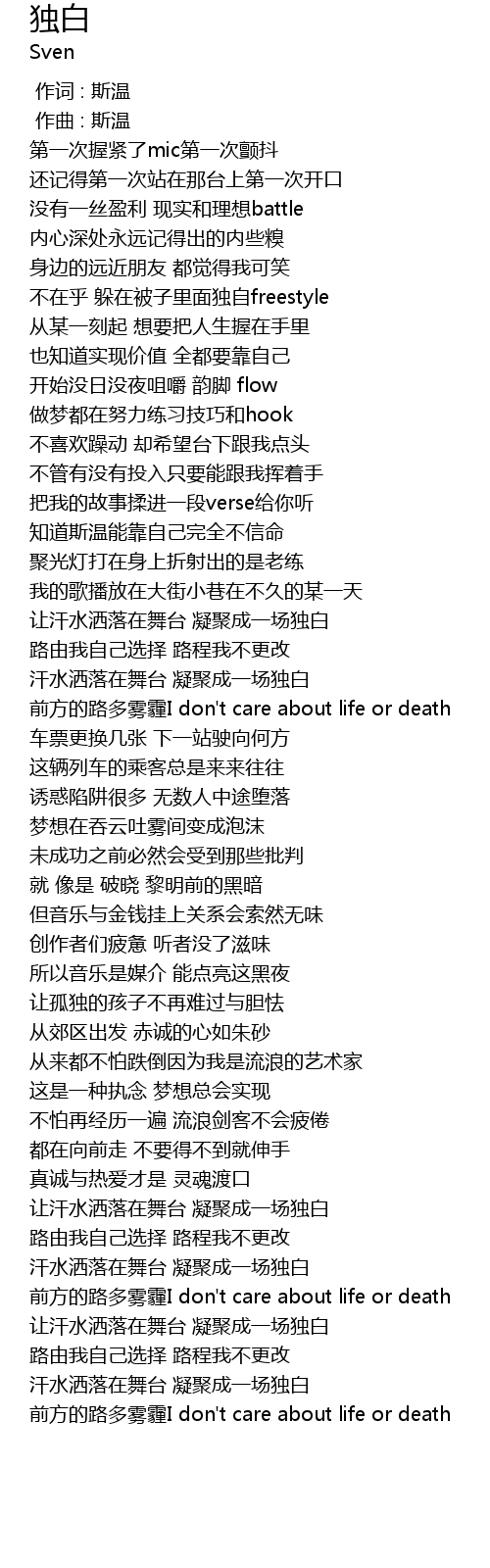| [00:33.585] | bù zài hu duǒ zài bèi zi lǐ miàn dú zì freestyle |