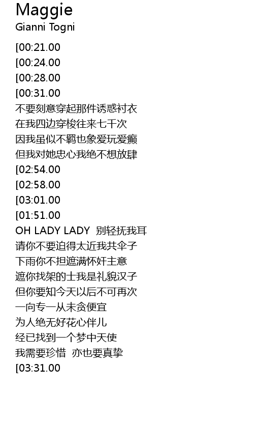 | [03:12.00][02:58.00][01:44.00][00:59.00] | MY MY MY MY MAGGIE 是心中暖意 |