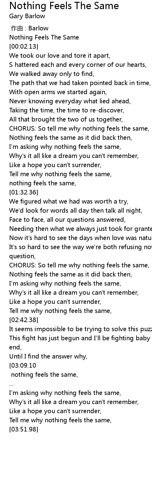 | [02:37.49] | Tell me why nothing feels the same, |