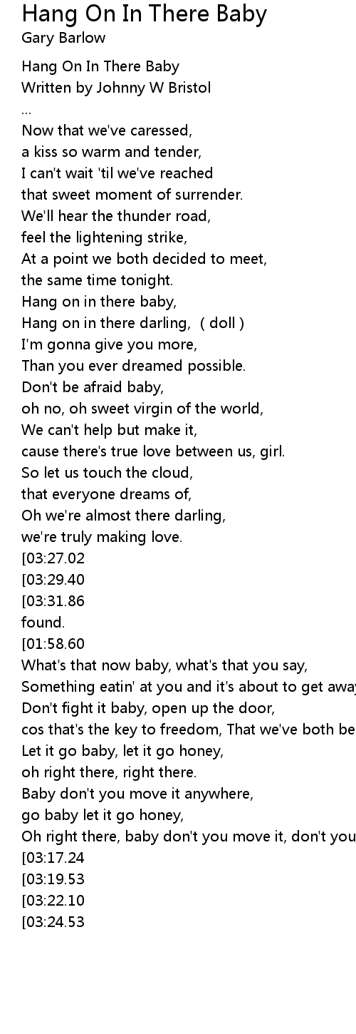 | [03:46.59][03:27.02][03:07.39][01:49.01] | Hang on in there baby, |