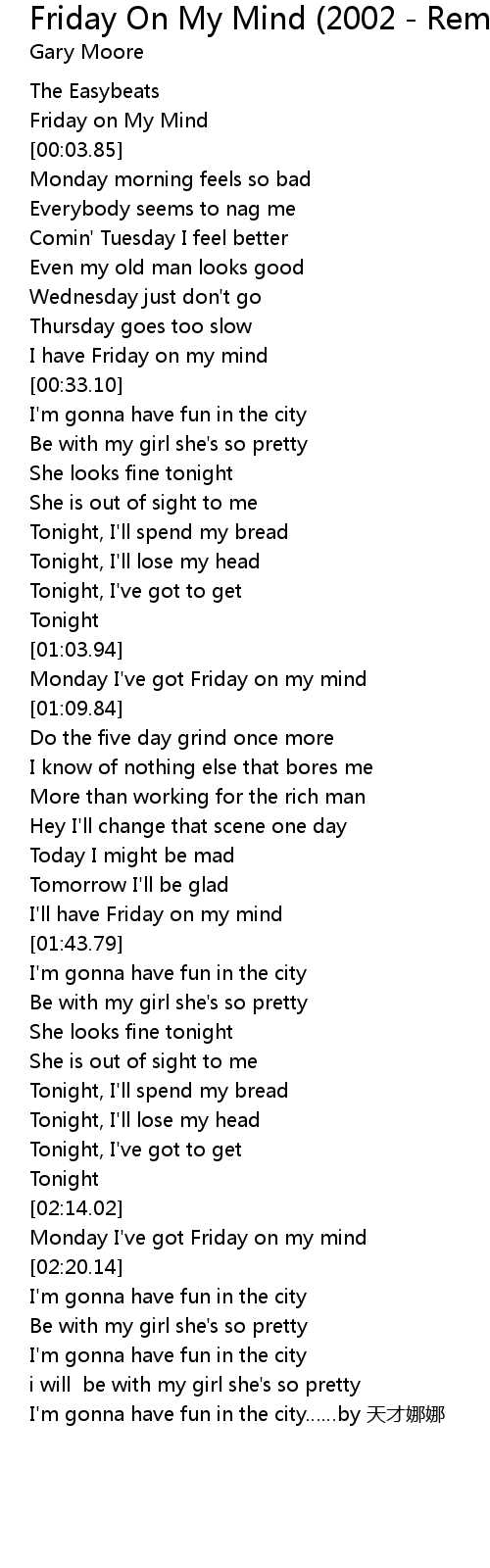 | [02:16.20] | Monday I' ve got Friday on my mind |