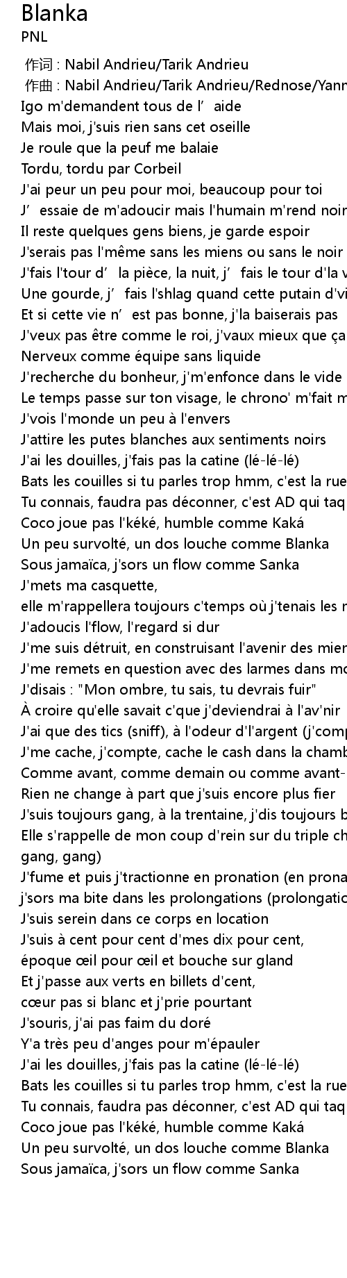 | [01:33.99] | J' attire les putes blanches aux sentiments noirs |
