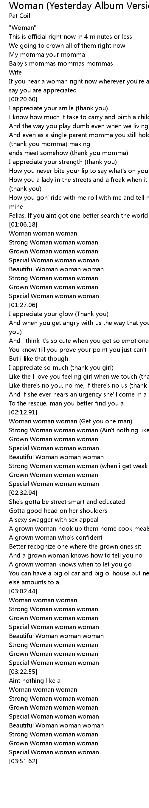 | [00:13.83] | If you near a woman right now wherever you're at just turn to em and say you are appreciated |