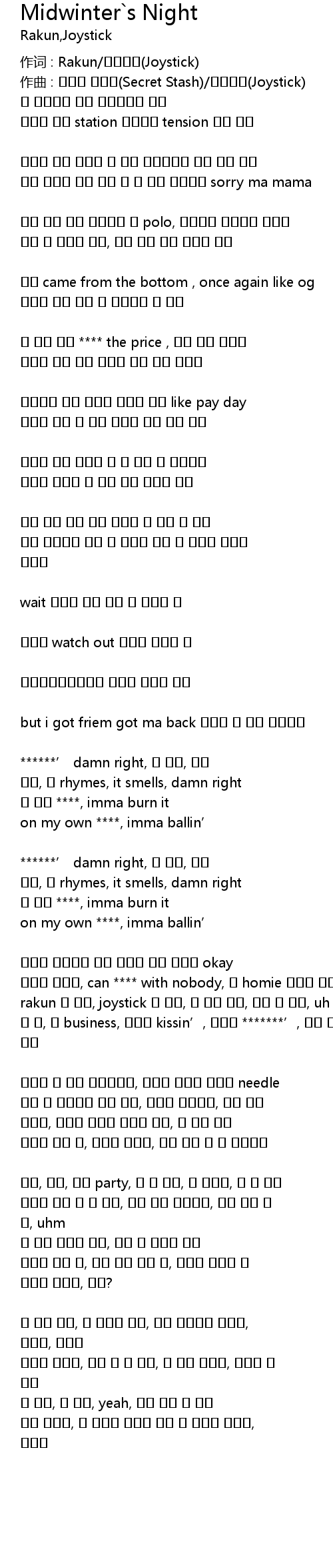 좆 까, 네 business, 똥꼬에 kissin’, 좆같은 *******’, 우린 안 끼지 |