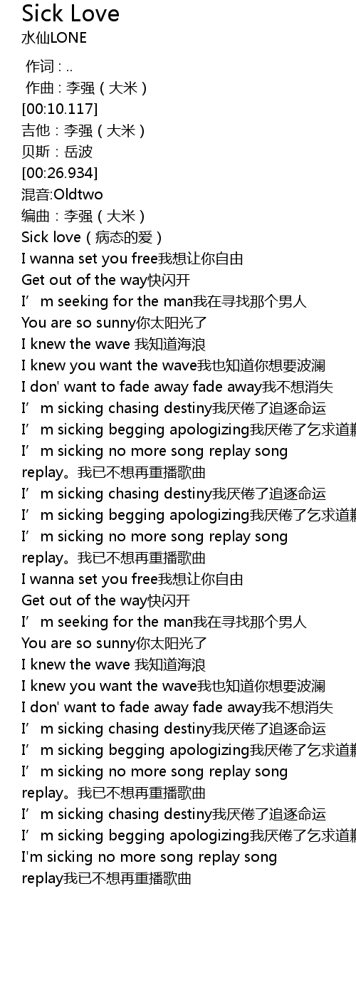 | [01:58.059] | I' m sicking no more song replay song replay. wǒ yǐ bù xiǎng zài chóng bō gē qǔ |