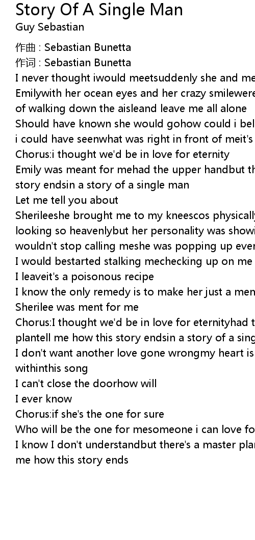 | Chorus:I thought we'd be in love for eternityhad the upper handbut the master plantell me how this story endsin a story of a single man | |