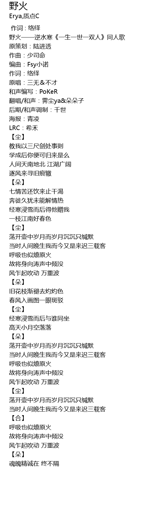 | [00:01.70] | 野火——逆水寒《一生一世一双人》同人歌 |
