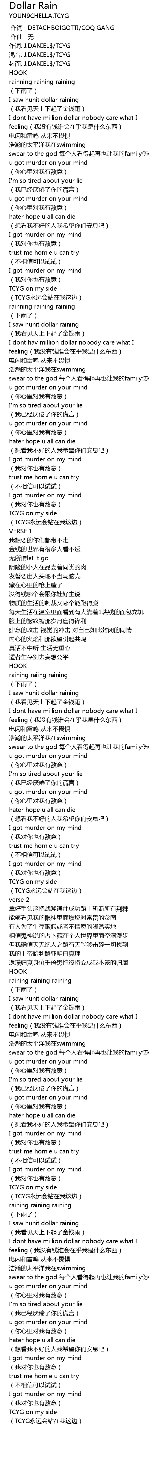 | [00:41.308] | I dont hav million dollar nobody care what I feeling wǒ méi yǒu qián shuí huì zài hu wǒ shì shén me dōng xī |