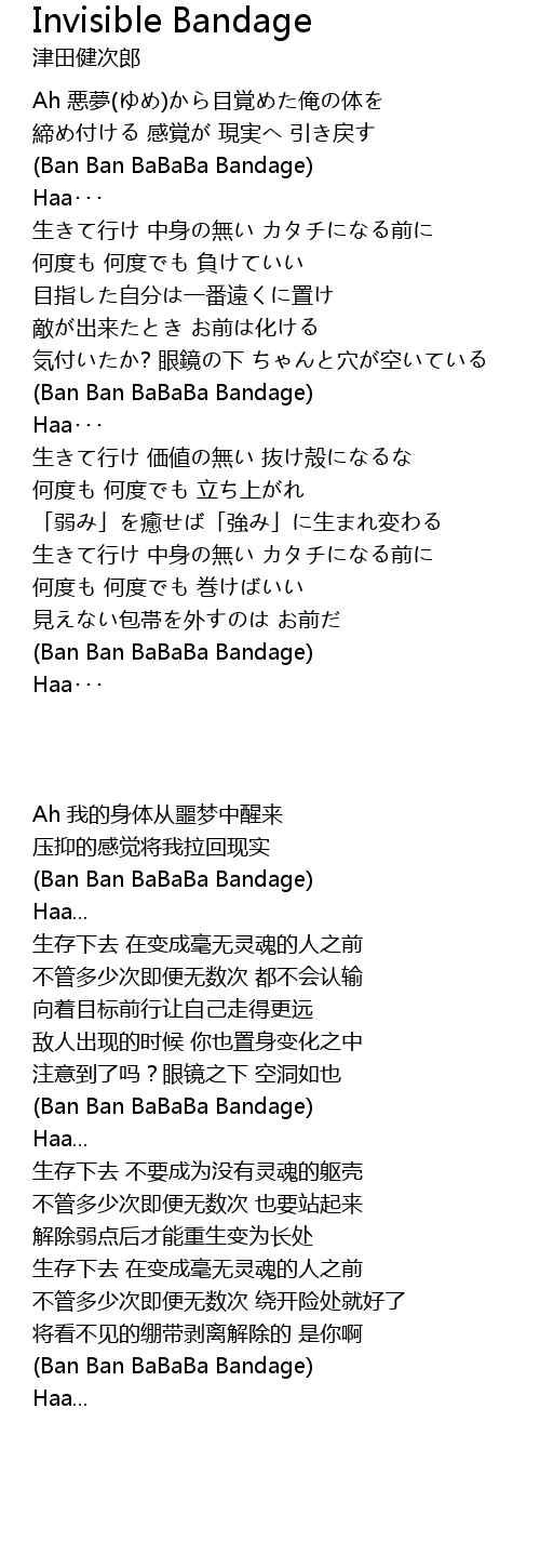 | [03:17.682] | 見えない包帯を外すのは お前だ |