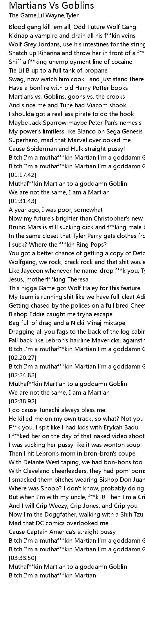 | [02:16.35] | Bitch I'm a muthaf**kin Martian I'm a goddamn Goblin |