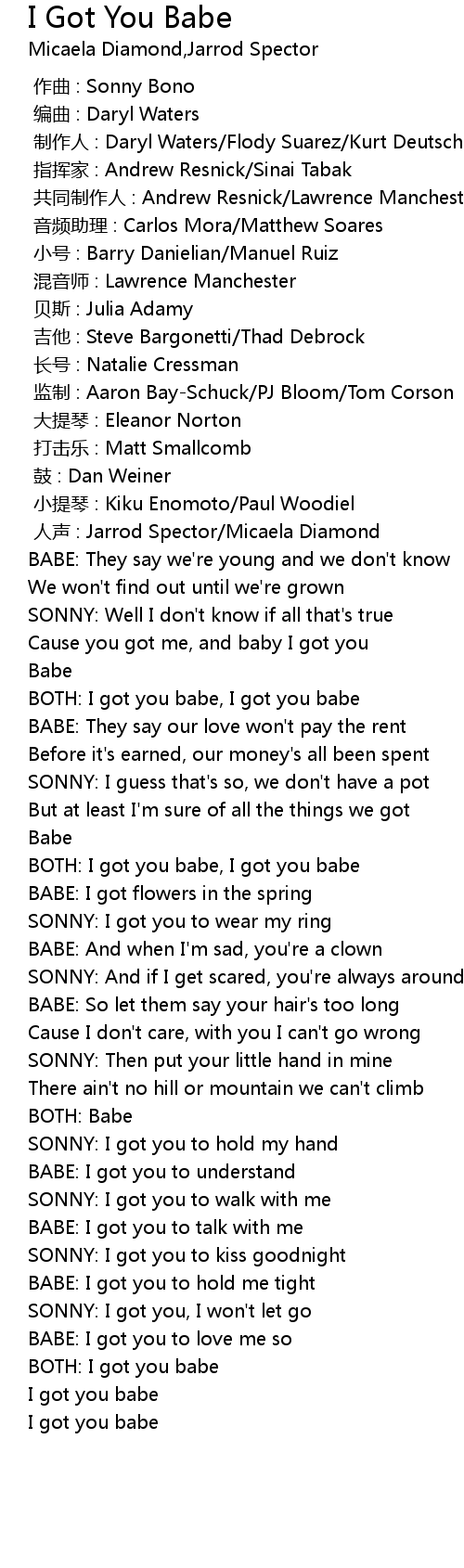 | [00:27.685] | BOTH: I got you babe, I got you babe |