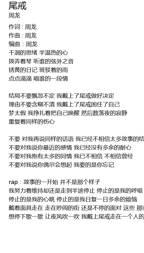 | rap:故事的一开始 并不是那个样子 我努力着维持却还是走到半途停止 停止的是我的呼吸 停止的是我的心跳 停止的是我日复一日多余的烦恼 戴着面具走在 走在吵闹的街 还是不停的面对 这些 那些 想停下歇一歇 让夜风吹一吹 我戴上尾戒走在一个人的街 |