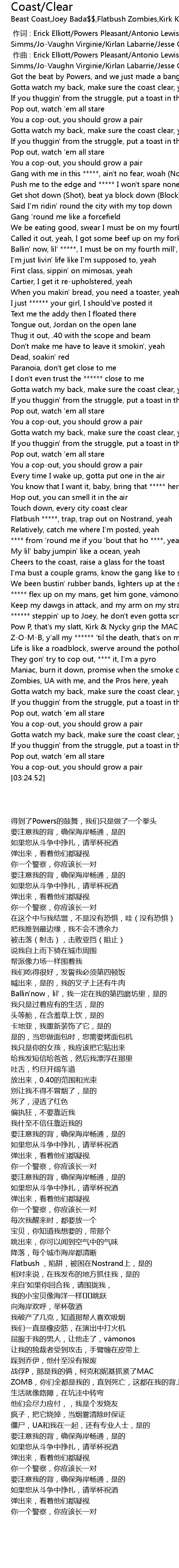 | [03:00.53] | Gotta watch my back, make sure the coast clear, yeah |