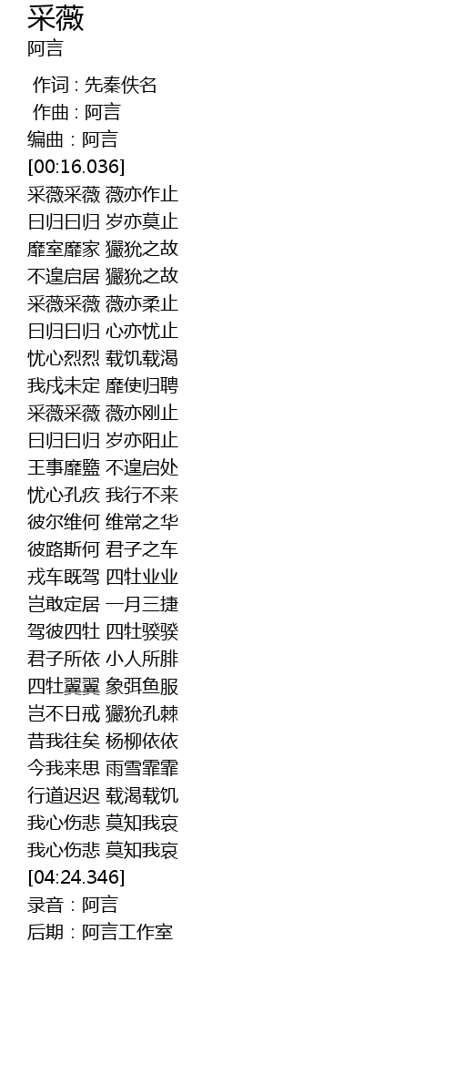 | [01:59.765] | 采薇采薇 薇亦刚止 |