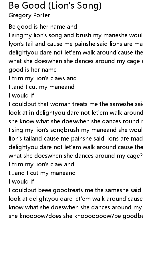 I singmy lion's song and brush my maneshe would if she couldso she pulled my lyon's tail and cause me painshe said lions are made for cagesjust to look at in delightyou dare not let'em walk around'cause they might just bitedoes she know what she doeswhen she dances around my cage and says her namebe good be goodbe good is her name |