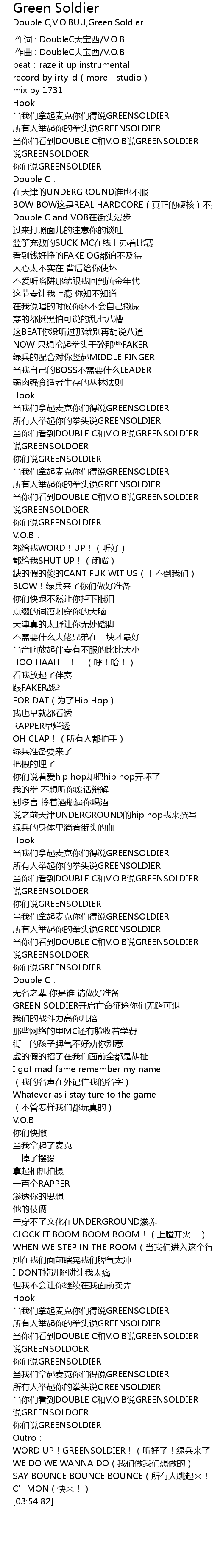 | [02:09.49] | 当你们看到DOUBLE C和V.O.B说GREENSOLDIER |