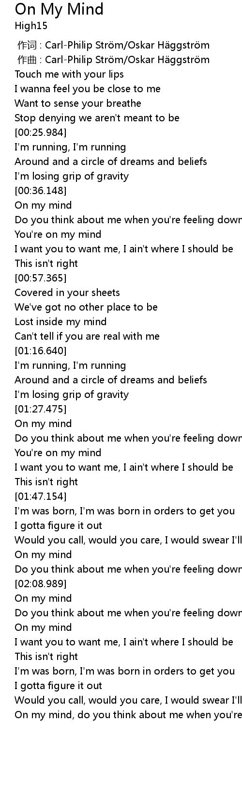 | [02:51.775] | On my mind, do you think about me when you' re feeling down? yeah |