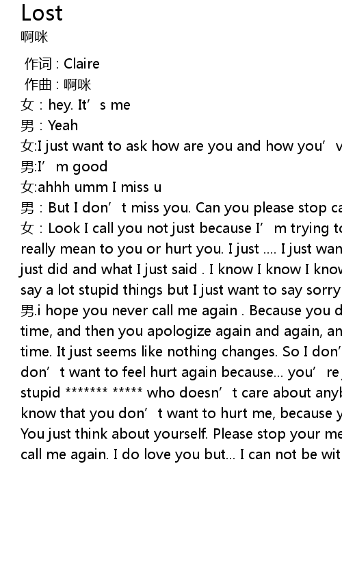 | [01:56.040] | 男.i hope you never call me again . Because you do the **** all the time, and then you apologize again and again, and I forgive you every ******* time. It just seems like nothing changes. So I don’t want to forgive you, I don’t want to feel hurt again because... you’re just his kind of like a stupid ******* ***** who doesn’t care about anybody. You’re so selfish, I know that you don’t want to hurt me, because you don’t give a **** about me. You just think about yourself. Please stop your meaningless apologizes and never call me again. I do love you but... I can not be with you anymore. Bye. |
