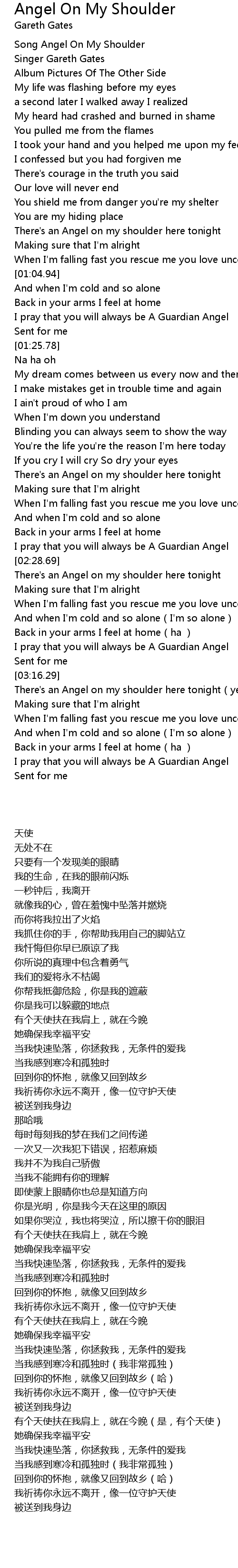 | [01:59.48] | There's an Angel on my shoulder here tonight |