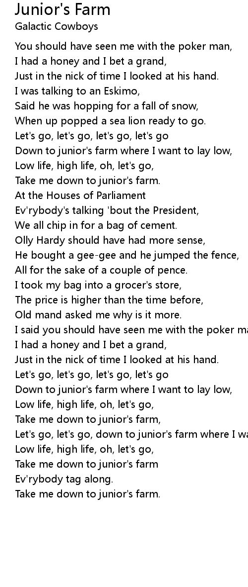 Let's go, let's go, down to junior's farm where I want to lay low. |