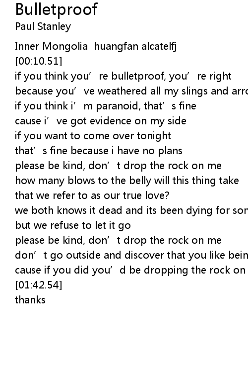| [00:10.90] | if you think you' re bulletproof, you' re right |