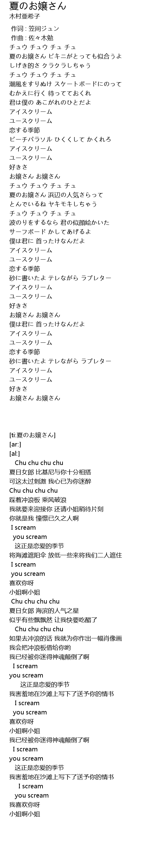 | [00:18.83] | 夏のお嬢さん ビキニがとっても似合うよ |