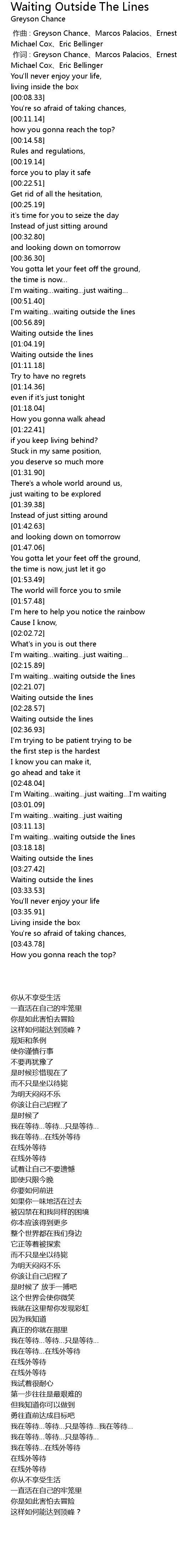 | [02:17.14] | I' m waiting waiting outside the lines |