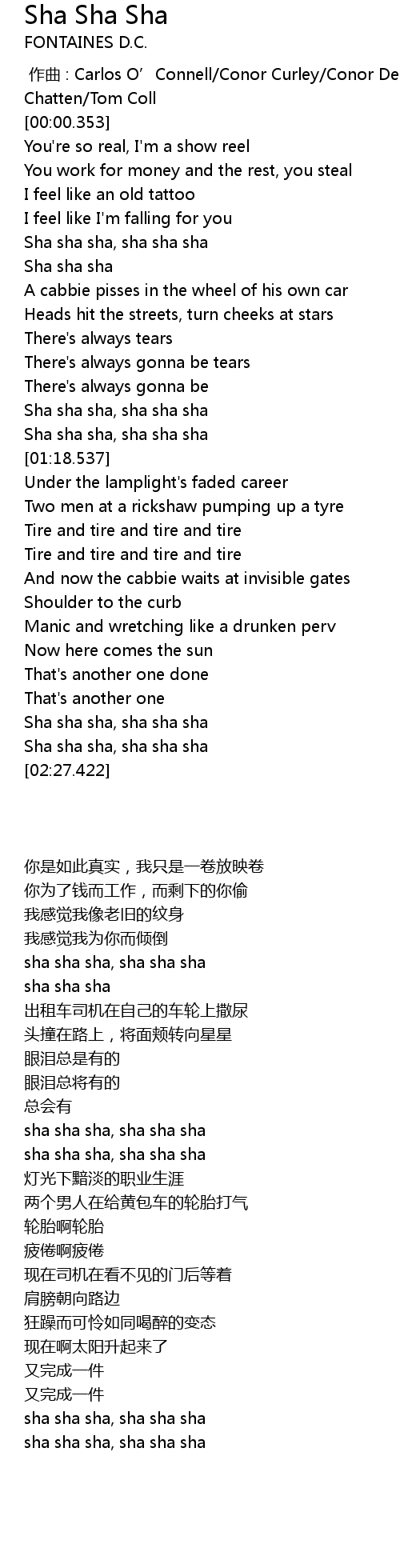 | [01:08.454] | Sha sha sha, sha sha sha |