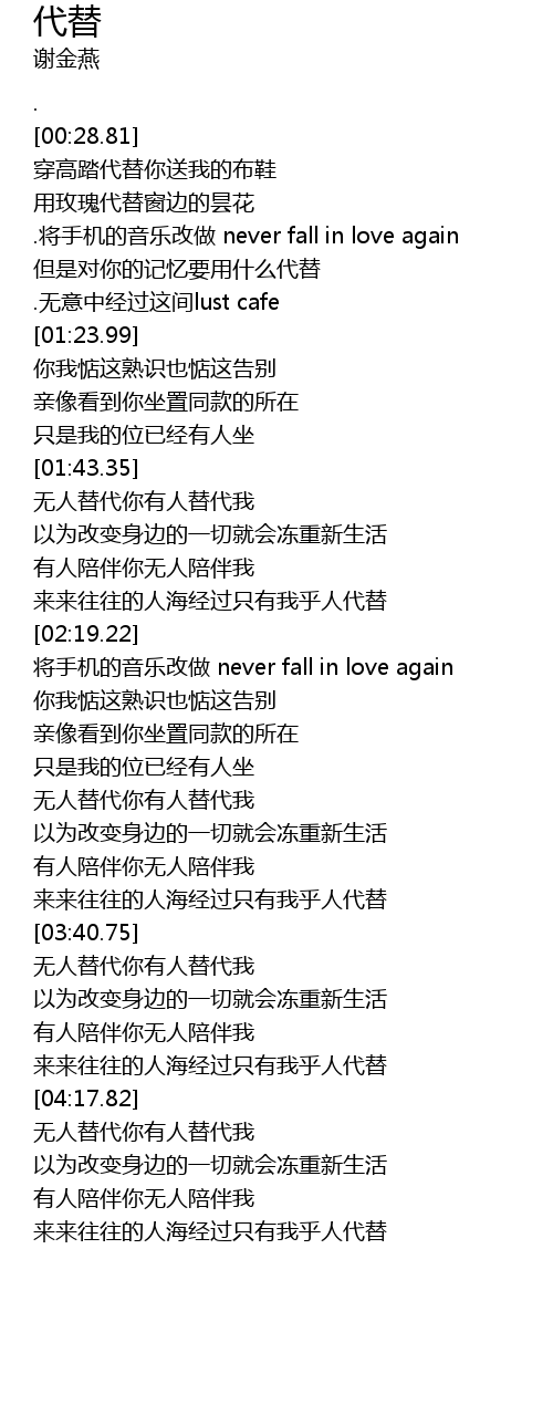| [04:18.81] | wú rén tì dài nǐ yǒu rén tì dài wǒ |