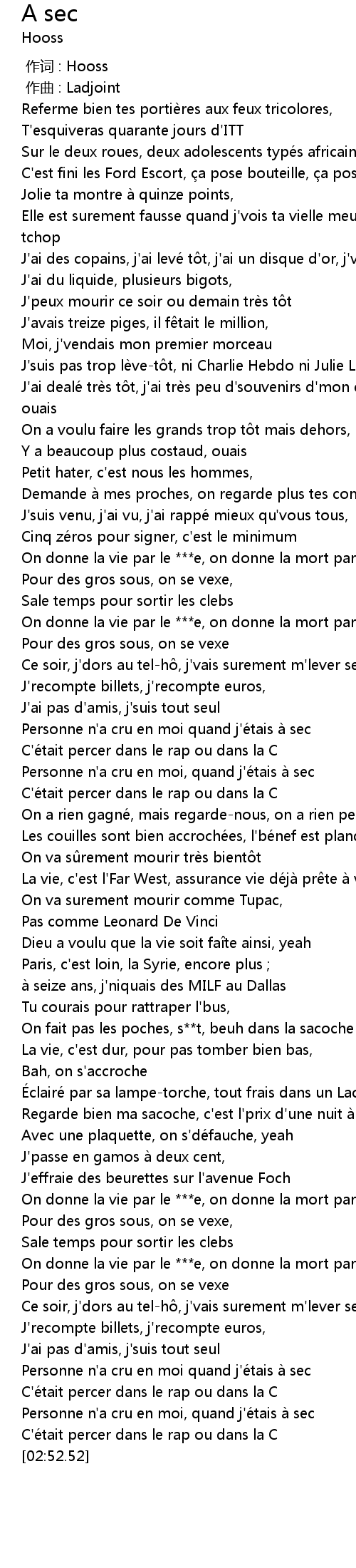 | [02:10.99] | J'effraie des beurettes sur l'avenue Foch |