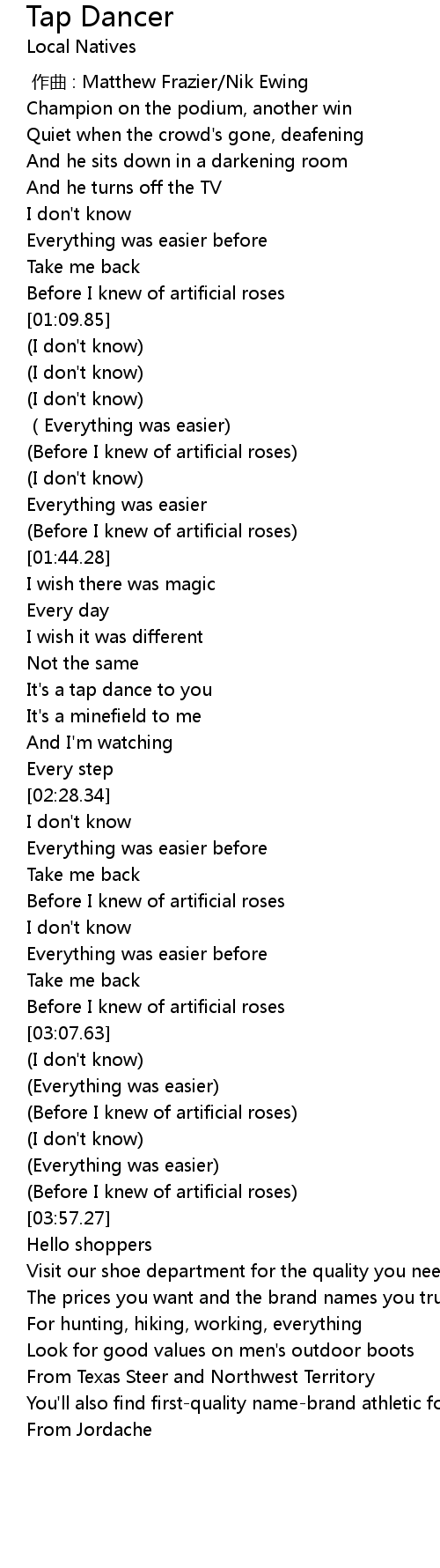 | [03:58.66] | Visit our shoe department for the quality you need |