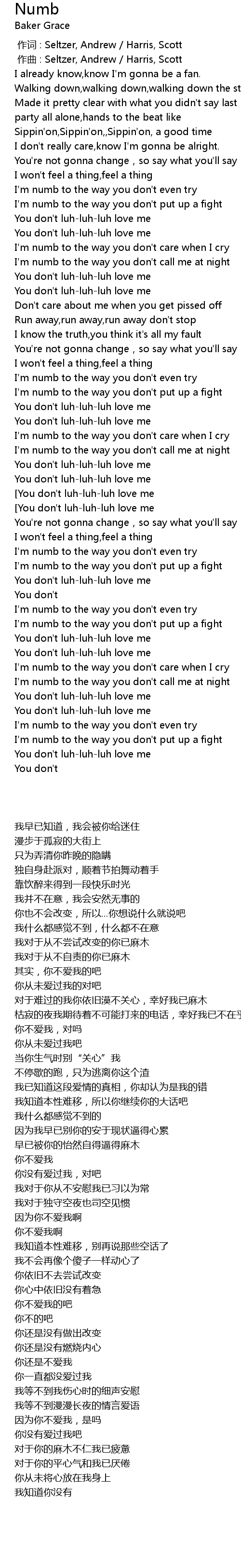 | [00:53.258] | I' m numb to the way you don' t call me at night |