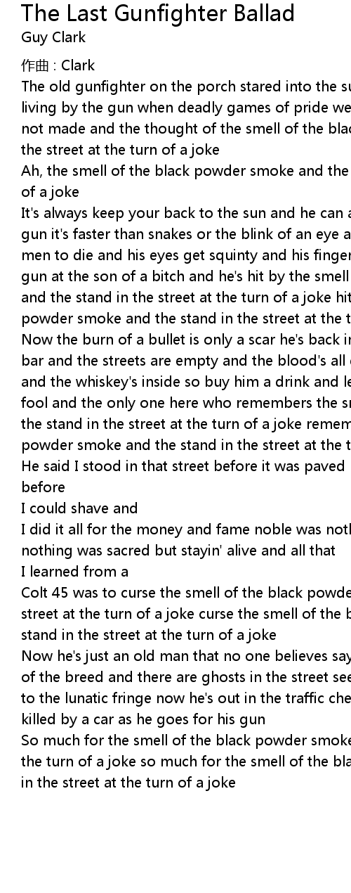 | It's always keep your back to the sun and he can almost feel the weight of the gun it's faster than snakes or the blink of an eye and it's a time for all slow men to die and his eyes get squinty and his fingers twitch and he empties the gun at the son of a bitch and he's hit by the smell of the black powder smoke and the stand in the street at the turn of a joke hit by the smell of the black powder smoke and the stand in the street at the turn of a joke | |