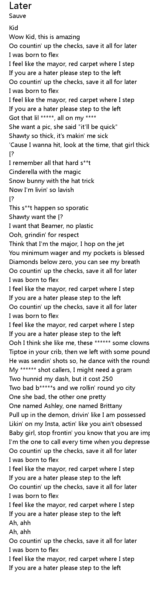 | [00:13.02] | Oo countin' up the checks, save it all for later |