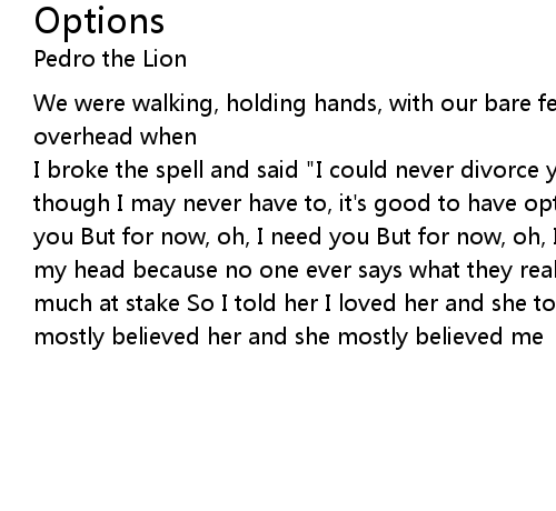 | I broke the spell and said "I could never divorce you without a good reason and though I may never have to, it's good to have options But for now, oh, I need you But for now, oh, I need you But for now, oh, I need you But it was only in my head because no one ever says what they really mean to say when there's so much at stake So I told her I loved her and she told me she loved me and I mostly believed her and she mostly believed me |