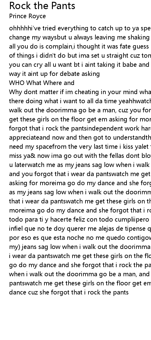 Why dont matter if im cheating in your mind what the hell might as well be out there doing what i want to all da time yeahhwatch me as my jeans sag low when i walk out the doorimma go be a man, cuz you forgot that i wear da pantswatch me get these girls on the floor get em asking for moreima go do my dance and she forgot that i rock the pantsindependent work hard for all the above and that i appreciateand now and then got to understandthat a man got a breathe , that i need my spacefrom the very last time i kiss yalet there be a gap give me time to miss ya& now ima go out with the fellas dont blow my cell be cool and ima catch u laterwatch me as my jeans sag low when i walk out the doorimma go be a man, and you forgot that i wear da pantswatch me get these girls on the floor get em asking for moreima go do my dance and she forgot that i rock the pantswatch me as my jeans sag low when i walk out the doorimma go be a man, and you forgot that i wear da pantswatch me get these girls on the floor get em asking for moreima go do my dance and she forgot that i rock the pantseh tratado de ser todo para ti y hacerte feliz con todo cumpliipero siempre dices que yo soy infiel que no te doy querer me alejas de tipense que gane pero creo que falle por eso es que esta noche no me quedo contigowatch me as im gone (watch me as my) jeans sag low when i walk out the doorimma go be a man, and she forgot that i wear da pantswatch me get these girls on the floor get em asking for moreima go do my dance and she forgot that i rock the pantswatch me as my jeans sag low when i walk out the doorimma go be a man, and she forgot that i wear da pantswatch me get these girls on the floor get em asking for moreima go do my dance cuz she forgot that i rock the pants |