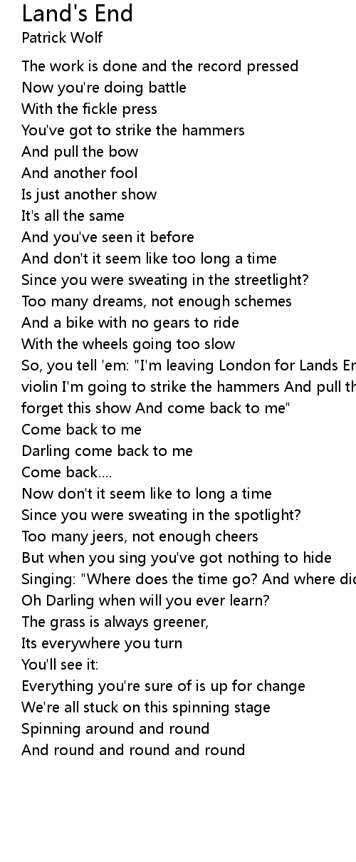 So, you tell 'em: "I'm leaving London for Lands End With a green tent and a violin I'm going to strike the hammers And pull the bow Just another day to forget this show And come back to me" |