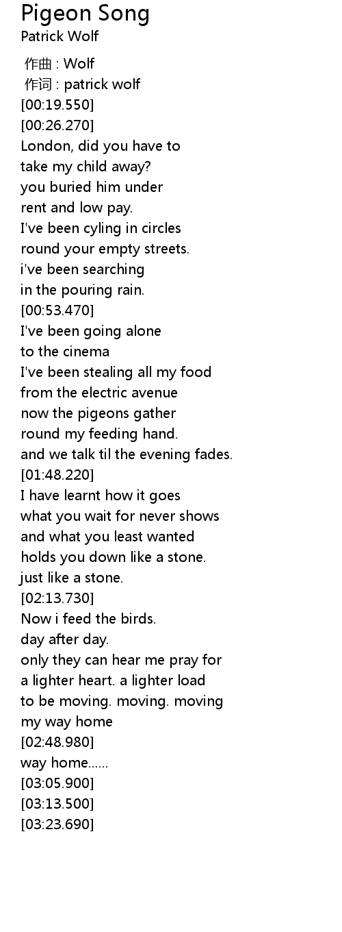 | [01:35.600] | now the pigeons gather |