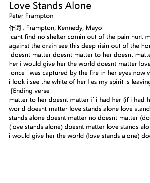 | Verse 1 cant find no shelter comin out of the pain hurt my self bleeding against the drain see this deep risin out of the home must be the exits the one in my soul Chorus doesnt matter doesnt matter to her doesnt matter if i had her i would give her the world doesnt matter love stands alone love stands alone doesnt matter no Verse 2 once i was captured by the fire in her eyes now when i look i see the white of her lies my spirit is leaving i see her light it can be heaven with her still inside Chorus Ending verse doesnt matter doesnt matter to her doesnt matter if i had her if i had her i would give her the world doesnt matter love stands alone love stands alone love stands alone love stands alone doesnt matter no doesnt matter doesnt matter doesnt matter to her love stands alone doesnt matter love stands alone if i had her if i had her i would give her the world love stands alone doesnt matter doesnt matter no... |